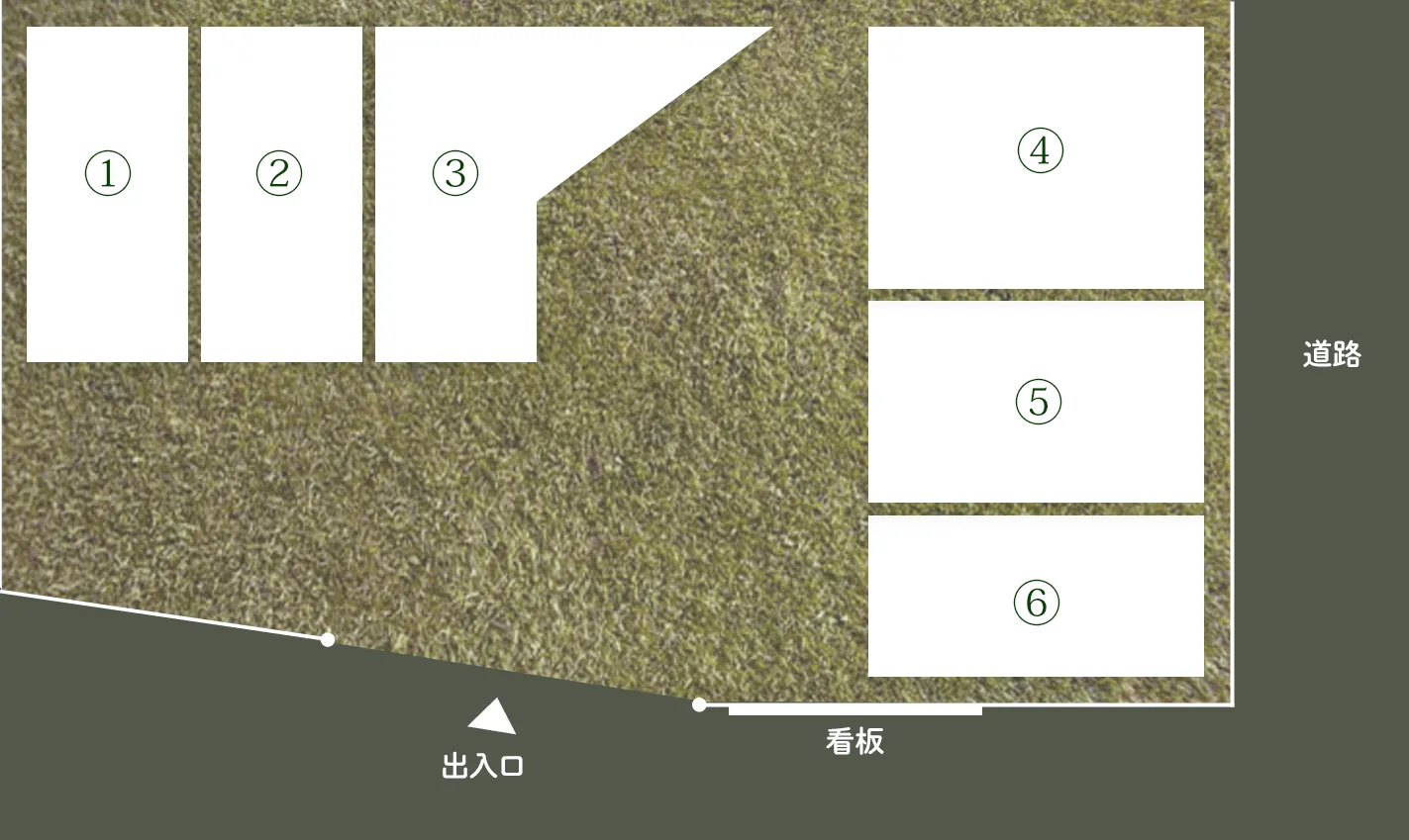 ① ② ⑥…3m*6m ③…3m*6m+α④…5.4m*6m⑤…4m*6m出入口…7m